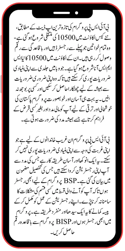 According to the latest update of the BISP program, the transfer of 10500 to the new case account has started—all those women who are already registered and receiving money regularly. A new SMS of 10500 has begun to be received in his account. Those who can quickly fulfill their basic needs so that they can get rid of their essential needs forever and not become a burden on anyone. This straightforward and beautiful program provides you with financial help without any loan for the prosperity and development of Pakistan, which always needs help.