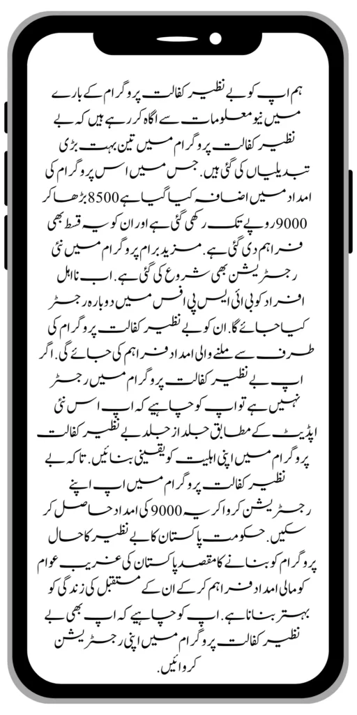 We are informing you with new information about the Benazir Kafalat program three major changes have been made in the Benazir Kafalat program. In which the aid of this program has been increased from 8500 to 9000 rupees and its fee has also been reduced to installments. Further, new registrations have also been started in the BRAM program. Now ineligible persons will be re-registered in the BISP office.