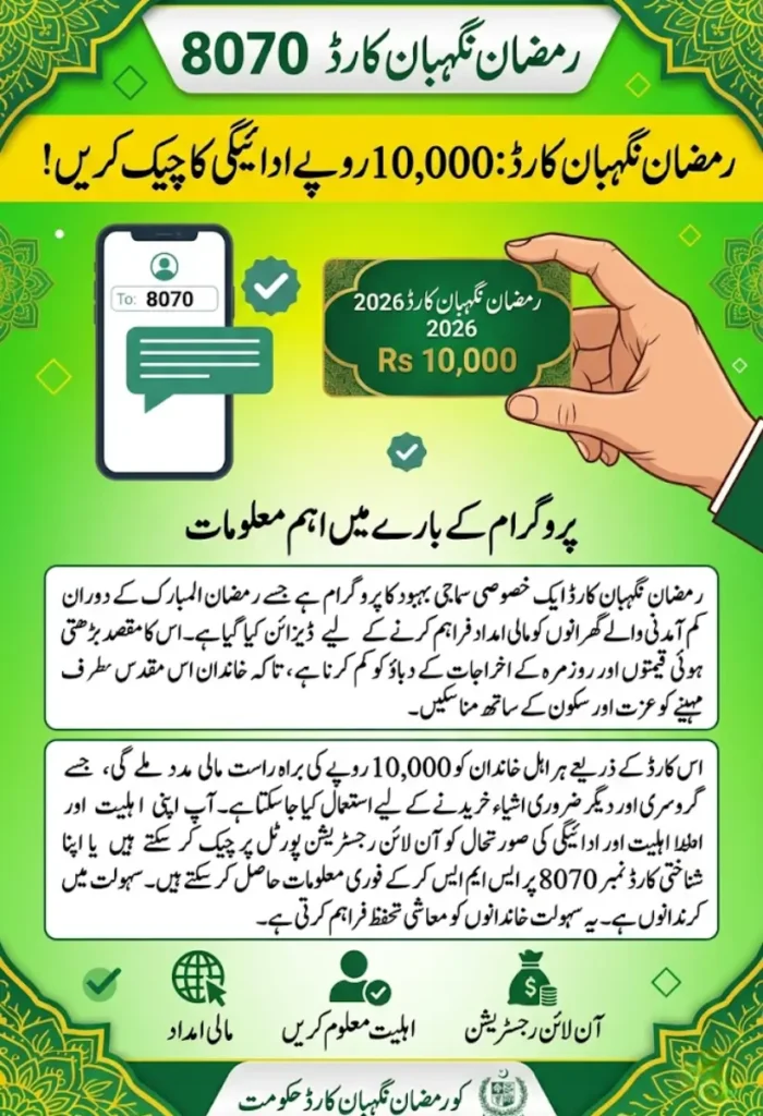 8070 Ramzan Nigehban Card 2026 is a valuable initiative designed to provide essential financial support to families with limited income. By offering Rs. 10,000 per eligible household, the program helps reduce the burden of daily expenses during Ramadan.
