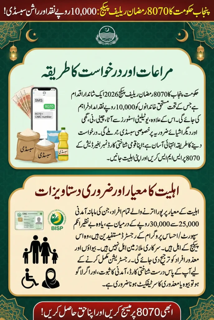 8070 Ramzan Relief Package 2026 is a government initiative to provide financial assistance and essential food to low-income families during the holy month of Ramadan. Beneficiaries can receive subsidies on staple goods such as flour, sugar, and cooking oil through registered utility stores.