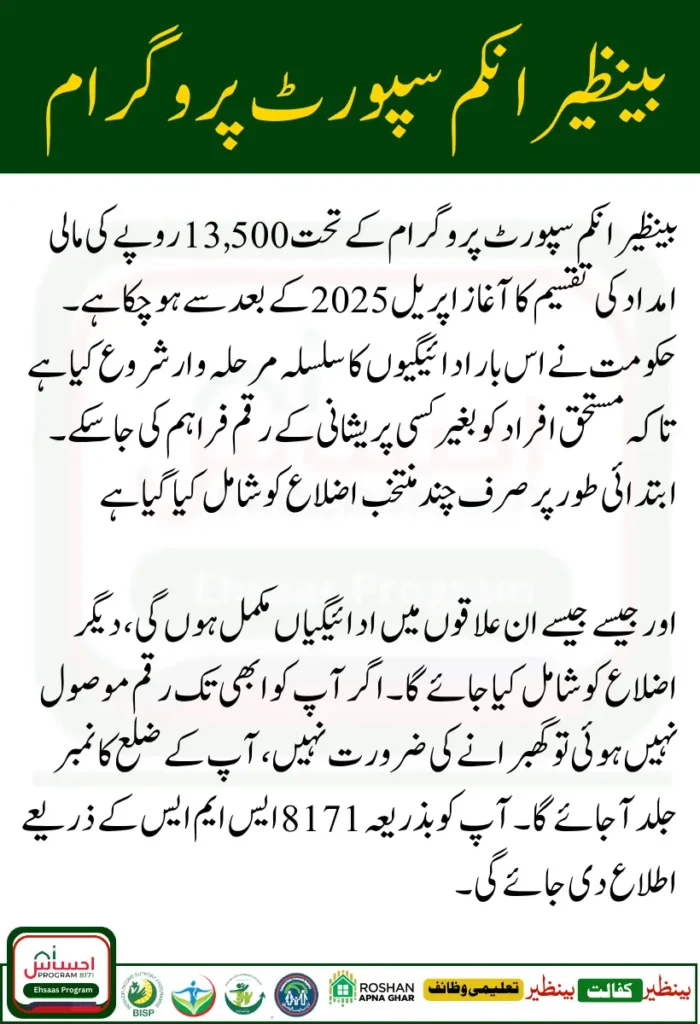 اگر آپ بینظیر انکم سپورٹ پروگرام سے فائدہ اٹھانا چاہتے ہیں تو ضروری ہے کہ آپ کا نیشنل سوشیو اکنامک رجسٹری (NSER) سروے مکمل ہو اور آپ کا ریکارڈ تازہ ترین ہو۔ اپنی اہلیت معلوم کرنے کے لیے صرف اپنا شناختی کارڈ نمبر 8171 پر ایس ایم ایس کریں یا بی آئی ایس پی ہیلپ لائن پر رابطہ کریں۔ یاد رکھیں، صرف سرکاری ذرائع سے معلومات حاصل کریں اور کسی غیر مصدقہ شخص یا ویب سائٹ پر اعتبار نہ کریں۔ اگر آپ کو پیغام موصول نہ ہو یا کسی قسم کی دشواری ہو، تو قریبی بینظیر دفتر جا کر اصل شناختی کارڈ کے ساتھ رجوع کریں تاکہ مسئلہ کا حل ہو سکے۔