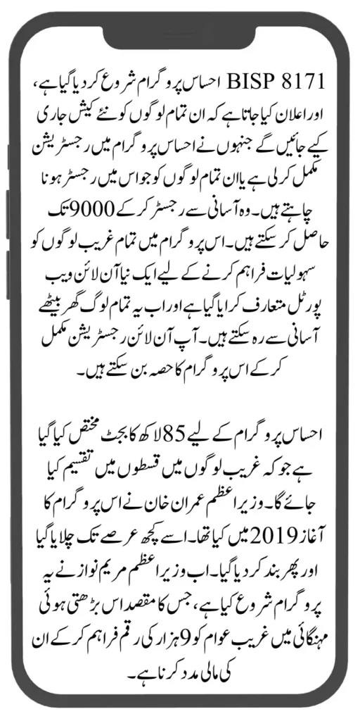 8171 BISP Ehsaas program, it has been announced to provide a new installment amount of 9 thousand. In this program, new online registration has been started, under which all people can complete their registration through the online web portal sitting at home. A budget of Eight. Five billion dollars have been allocated to this program. This program was started by Imran Khan in 2019, who was Prime Minister of Pakistan.
