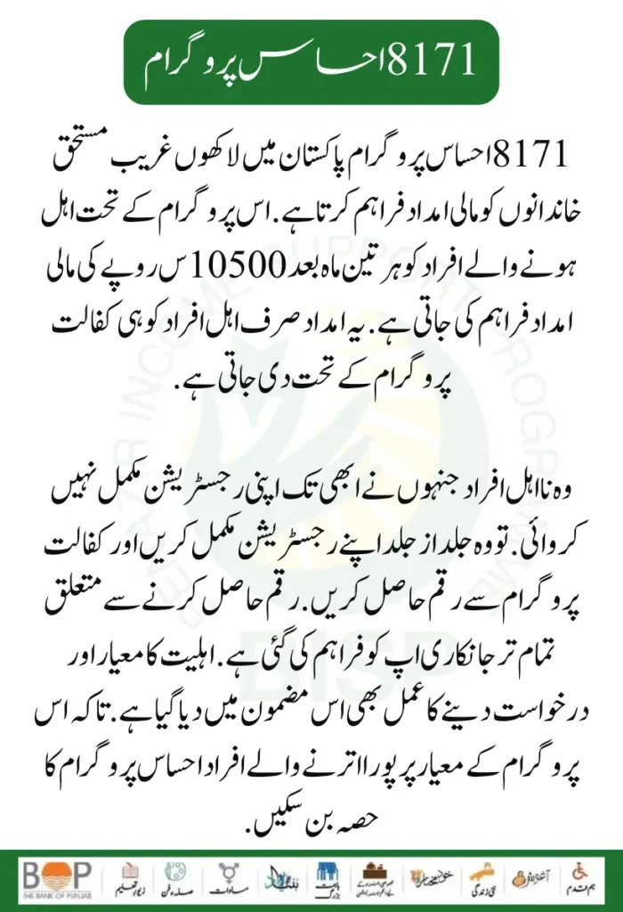 8171 Ehsaas programme provides financial assistance to millions of poor deserving families in Pakistan. Under this program, financial assistance of Rs. 10500 is provided every three months to eligible people. This assistance is given only to eligible persons under the sponsorship program. Those ineligible persons who have not yet completed their registration.