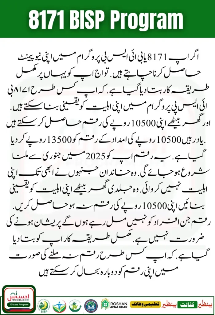 If you want to get your new payment in 8171 or BISP program. So here you have been the complete procedure for ensuring your eligibility in the 8171 BISP program. And you can get your money of 10500 rupees sitting at home. Remember that the amount of assistance of Rs.10500 has been increased to Rs.13500.