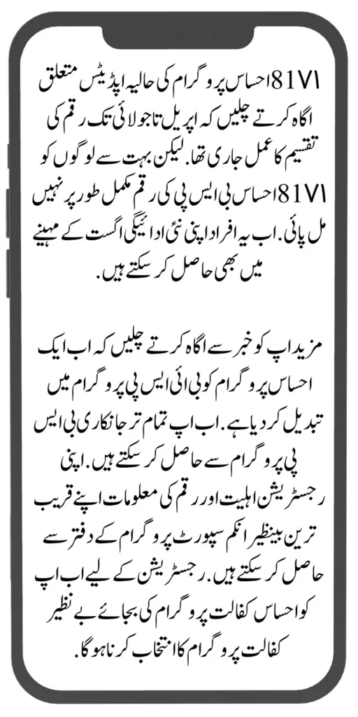 Let us further inform you that now Ehsaas program has been changed to the BISP program. Now you can get all the information from the BISP program. Information about your registration eligibility and amount can be obtained from your nearest Benazir Income Support Program office. For registration now you have to choose the Benazir Kafalat program instead of the Ehsaas Kafalat program.