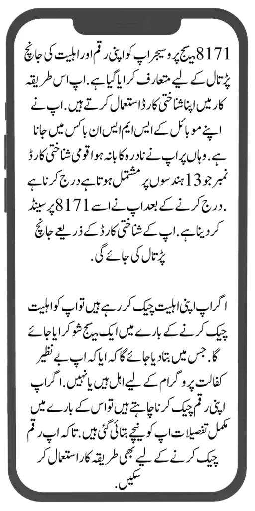 8171 Message Procedure Up has been introduced to check your amount and eligibility. You use your ID card in this procedure. You have gone to the SMS inbox of your mobile. There you have to enter the national identity card number created by NADRA which consists of 13 digits. After entering it you have to send it to 8171 and it will be checked through your identity card.