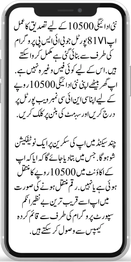 The verification process for a new payment of 10500 can be completed through the 8171 portal created by the BISP program. There is no fee etc. for this. Enter your CNIC number on the web portal for your new payment of Rs 10500 sitting at home and click on the submit button.