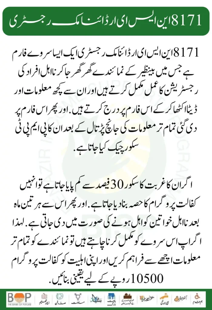 8171 NSER Dynamic Registry is a survey form in which representatives of Benazir go door to door to complete the process of registration of disabled persons collect some information and data from them and enter it on this form. And then after checking all the information given on this form, their PMPT score is checked.