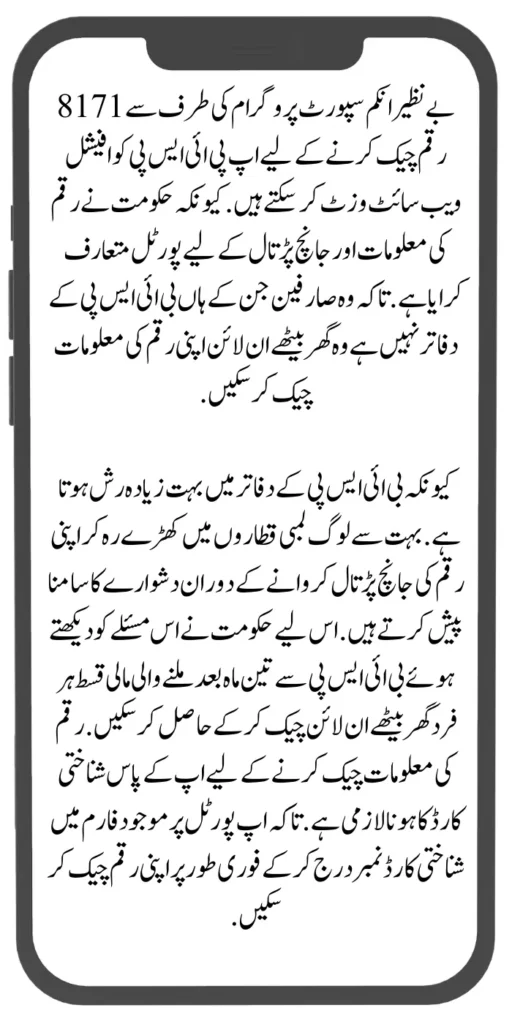 Benazir Kafalat Program 8171 Payment Eligible persons can check by sending their identity card number to BISP Code. People who want to check the new amount online at home. So for this, you must have a valid identity card made by Nadir. So that you can check your new sponsorship payment and get it immediately. Complete details about the checking amount are given below.