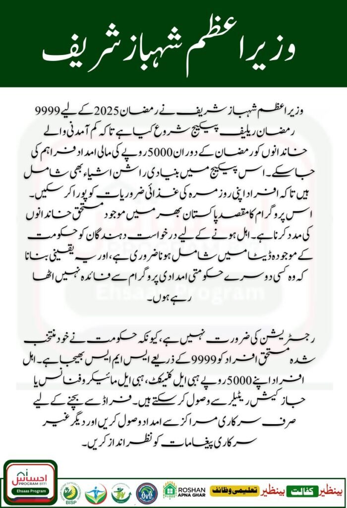 Prime Minister Shahbaz Sharif has launched the 9999 Ramzan Relief Package 2025 to provide Rs. 5000 to low-income families during Ramzan. This initiative also includes basic ration items to help meet daily nutrition needs. Unlike the 8070 Ramzan Relief Package for Punjab, this program is available nationwide. It will be supervised by the Prime Minister, while the 8070 Rashan program is managed by Maryam Nawaz.