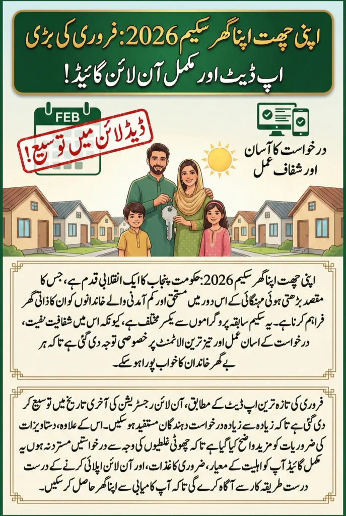 The Apni Chhat Apna Ghar Scheme 2026 presents a valuable opportunity for many families seeking affordable housing in Punjab. With clear eligibility requirements, a transparent online process, and the latest February updates in place, applicants now have better guidance to complete their submissions successfully.