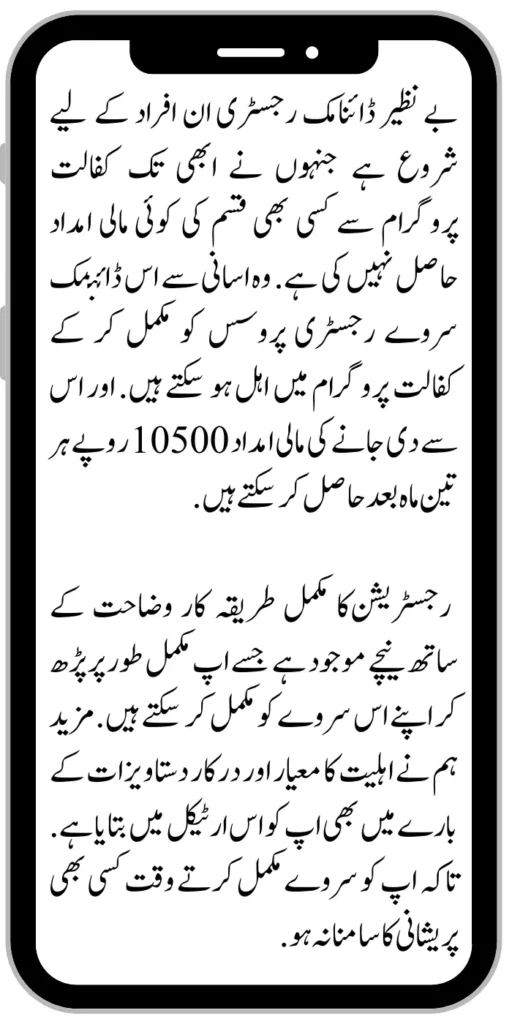 The Benazir Dynamic Registry is open to those individuals who have not yet received any financial assistance from the Kafalat program. They can easily qualify for the sponsorship program by completing this dynamic survey registry process. And you can get financial assistance of Rs 10500 every three months.