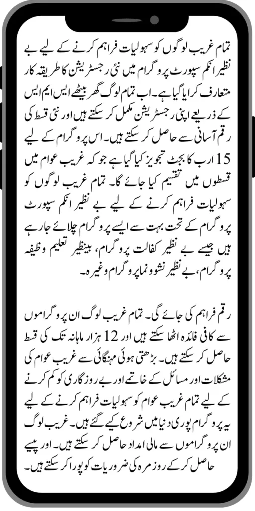 To provide facilities to all the poor people, the procedure of new registration has been introduced in the Benazir Income Support Program. Now all the people can complete their registration through SMS sitting at home and get the new installment amount easily. A budget of 15 billion has been proposed for this program, which will be distributed among the poor people in instalments. To provide facilities to all poor people, many such programs are being run under the Benazir Income Support Program such as the Benazir Kafalat Program, Benazir Taleemi Wazifa Program, Benazir Nashonuma Program etc.Β