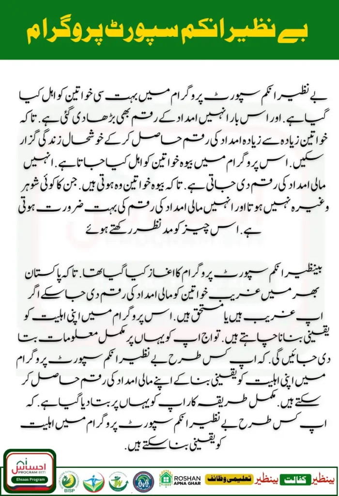 Benazir Income Support Program has made many women eligible. And this time the amount of aid has also been increased. So that women can lead a prosperous life by getting the maximum amount of aid. Widows are eligible in this program. Financial assistance is given to them. So widows are those. Those who do not have a husband etc. are in great need of financial assistance. Benazir Income Support Program was launched keeping this in mind.