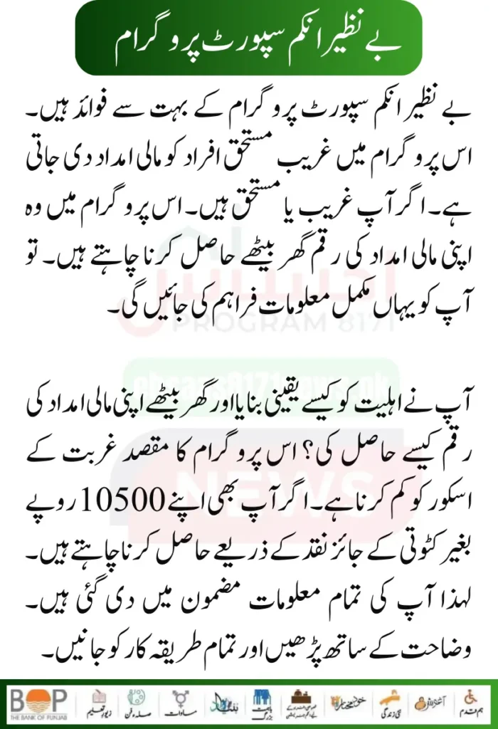 In the Benazir Income Support Program, an amount of 10,500 will go to you without any tax. No deduction will be made in it. If you want to get your amount of 10500 sitting at home. So follow the given procedure. And get your 10,500 home assistance immediately at home. Complete information has been given to you here. How you can ensure your eligibility in this program. And the procedure to get financial aid money sitting at home is very easy.