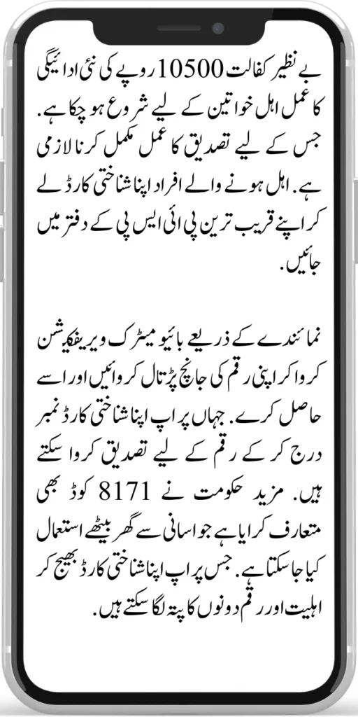 The process of new payment of Benazir Kafaalat 10500 has started for eligible women. For which the verification process must be completed. Eligible persons should go to their nearest 8171 BISP office with their identity card.