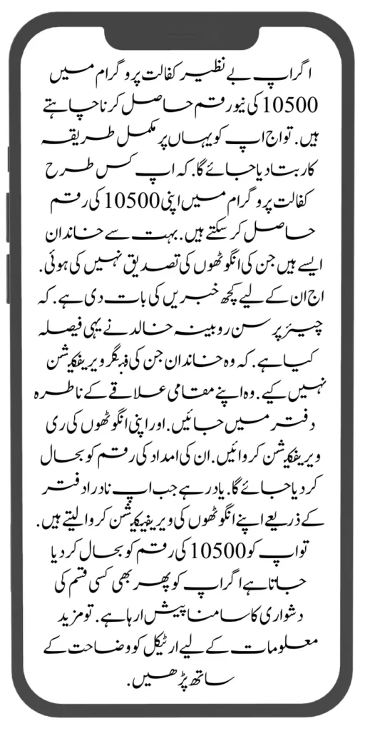 If you want to get a new amount of 10500 in the Benazir Kafaalat program, you will be told the complete procedure here. How can you get your 10500 in the sponsorship program? There are many families whose thumbs are not verified. I have some news for them: the chairperson, Rubina Khalid, has decided this.