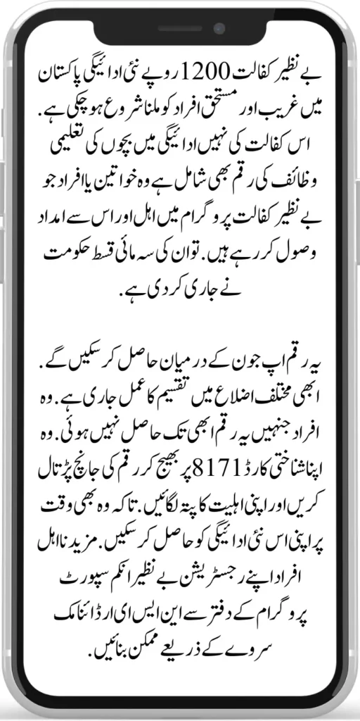 Those people who have not received this amount yet. They can send their identity card to 8171 to check the amount and determine their eligibility. So that they can also get their new payment on time. More ineligible persons can make their registration possible through the NSER Dynamic Survey from the Benazir Income Support Program office.