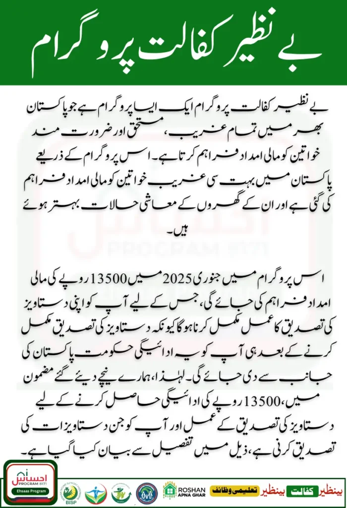 بے نظیر کفالت پروگرام ایک ایسا پروگرام ہے جو تمام غریب لوگوں کو مالی امداد فراہم کرتا ہے۔ اس پروگرام میں جنوری 2025 میں 13500 روپے کی امدادی رقم تقسیم کی جائے گی، جس میں تمام اہل افراد کو اس پروگرام میں شامل ہونا ہوگا۔ آپ کو اپنے تمام دستاویزات کی تصدیق کرنی ہوگی کیونکہ تصدیق کے بعد ہی آپ کو یہ ادائیگی دی جائے گی۔ لہذا، ذیل میں ان تمام دستاویزات کی فہرست اور تصدیق مکمل کرنے کا طریقہ ہے۔