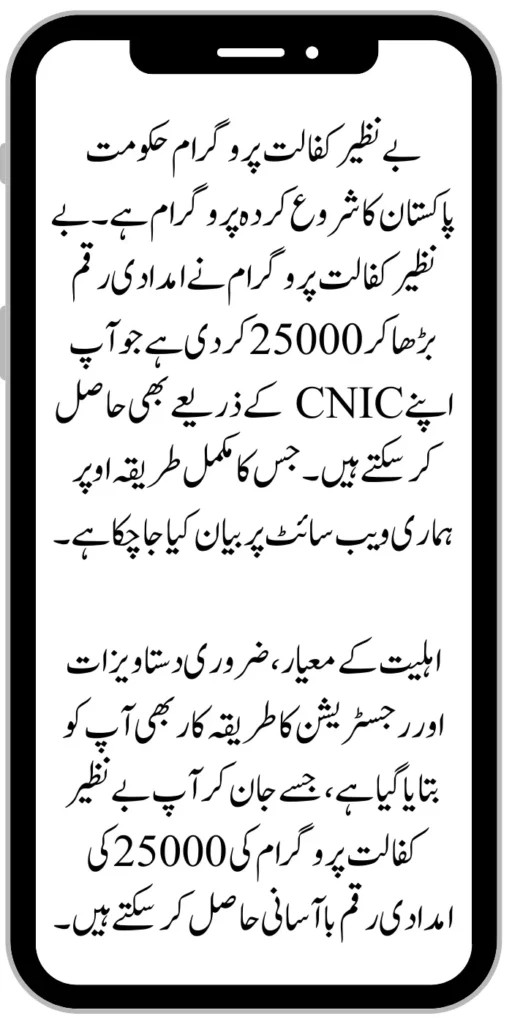 Benazir Kafaalat Program is a program started by the Government of Pakistan. Benazir Kafaalat Program has increased the aid amount to 25000 which you can also get through your CNIC. The complete method of which has been explained above on our website.
