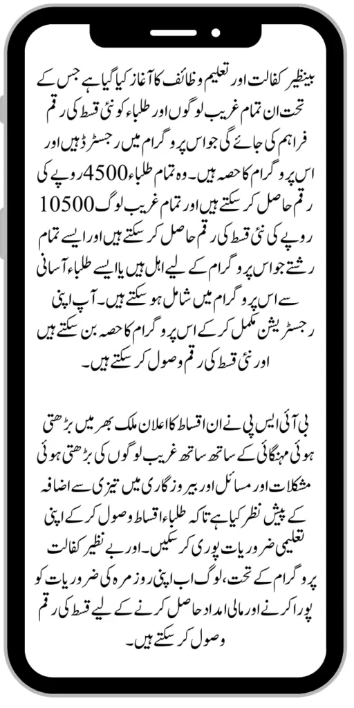 Benazir Kafaalat And Taleemi Wazaif have been launched under which new installment money will be provided to all poor people and students who are registered in this program and are part of this program. All those students can get the amount of Rs.4500 and all the poor people can get the new instalment amount of Rs.10500 and all such relations who are eligible for this program or such students can easily join this program. You can become a part of this program by completing your registration and receiving the new instalment amount.