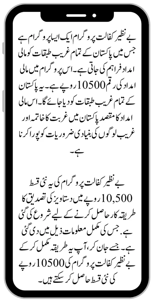 Benazir Kafaalat program is a program in which financial assistance is provided to all the poor sections of Pakistan. The amount of financial assistance in this program is 10500 rupees. It will be given to all the poor sections of Pakistan. The purpose of giving this financial aid is to eradicate poverty in Pakistan and to fulfil the basic needs of poor people.