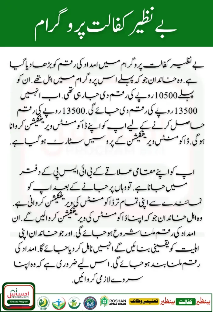 The amount of assistance has been increased in the Benazir Kafaalat Program. Those families who were previously eligible for this program. They were previously being given an amount of Rs. 10500. Now they will be given an amount of Rs. 13500. To get the amount of Rs. 13500, you will have to get your documents verified. The process of document verification has started.