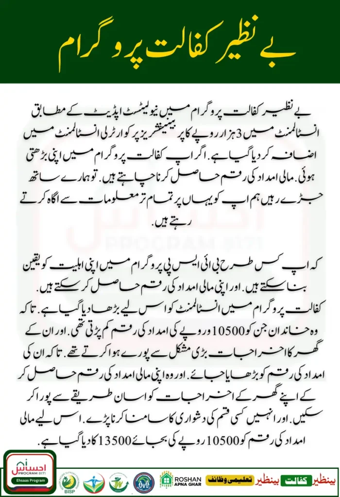 The instalment in the Kafalat Program has been increased. So those families who were short of the assistance amount of Rs 10,500. And their household expenses were met with great difficulty. So that their assistance amount is increased. And they can easily meet their household expenses by getting their financial assistance amount. And they have to face some kind of difficulty. Therefore, the financial assistance amount has been given to Rs 13,500 instead of Rs 10,500.