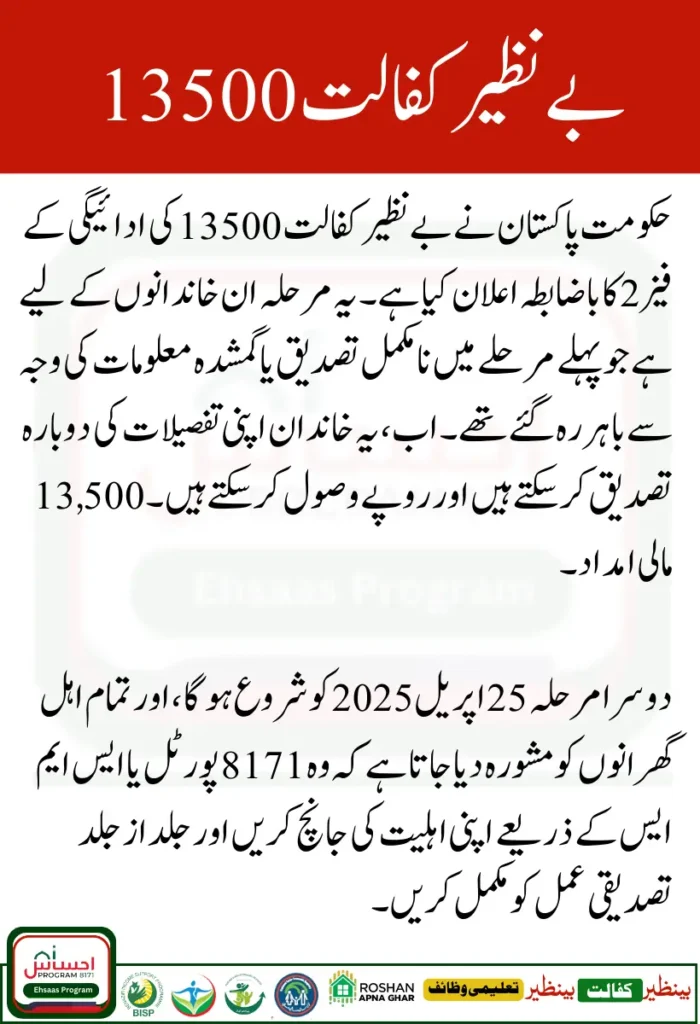 Government of Pakistan has officially announced Benazir Kafalat 13500 Phase 2. This phase is for families who missed out in the first round due to incomplete verification or missing information. Now, these families can re-verify their details and receive the Rs. 13,500 financial aid.