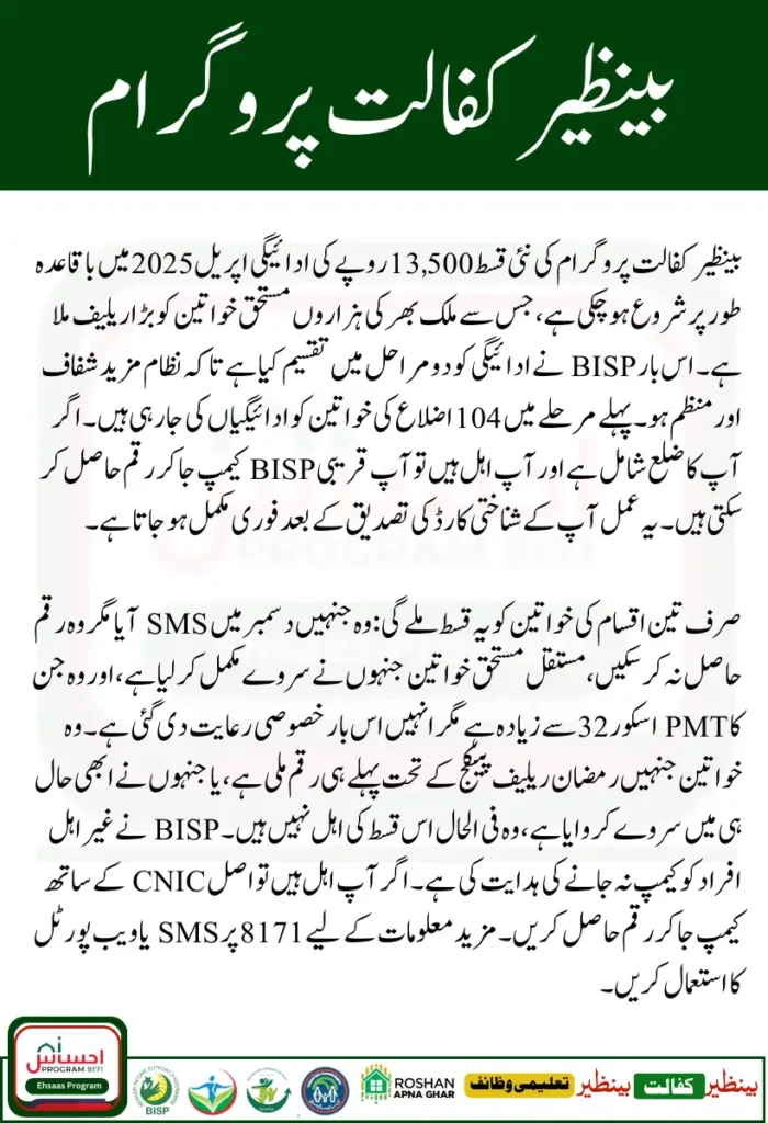 Benazir Kafalat Program April 2025 Quarterly installment of Rs. 13,500 for has officially begun, offering significant relief to thousands of underprivileged women across Pakistan. This time, the payment distribution process has been made more transparent and efficient by BISP, dividing it into two clear phases. This article explains who is eligible, who wonβt be paid, and how to easily collect your payment.