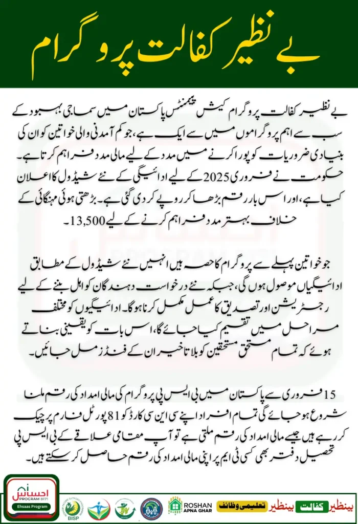 The Benazir Kafalat Program remains a cornerstone of social welfare in Pakistan, providing critical financial support to low-income families. With the increased payment of Rs. 13,500 starting in April 2025, the program is set to make an even greater impact. Beneficiaries are encouraged to complete their registration, verify their eligibility through the BISP 8171 SMS portal, and stay informed about official announcements to ensure seamless access to their payments.