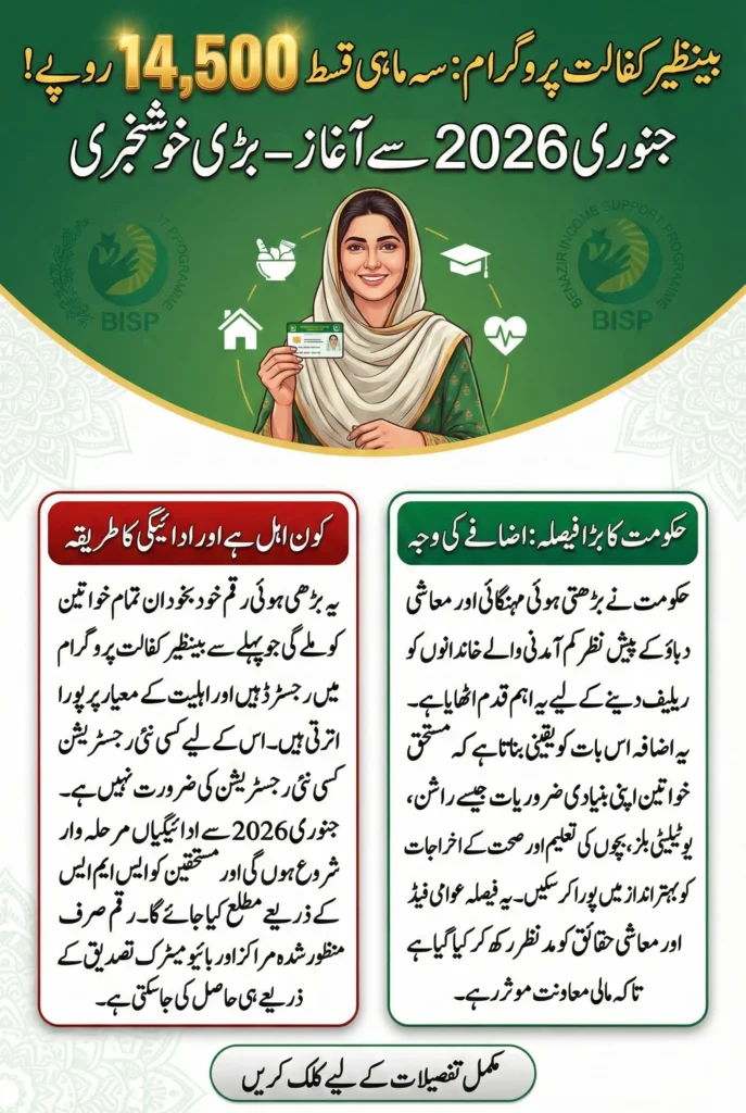 بنظیر کفالت پروگرام نے جنوری 2026 سے اپنے سہ ماہی ادائیگی کی رقم کو 14,500 روپے تک بڑھا دیا ہے، جو غریب اور کم آمدنی والے خاندانوں کے لیے بڑی راحت ہے۔ اس اضافہ کا مقصد خواتین کی قیادت والے گھروں کو مالی طور پر مستحکم کرنا اور روزمرہ کی ضروریات جیسے خوراک، تعلیم، اور صحت کی سہولیات میں آسانی پیدا کرنا ہے۔ اب مستحق خاندان زیادہ سکون کے ساتھ اپنے ماہانہ اور سہ ماہی اخراجات پورے کر سکیں گے۔