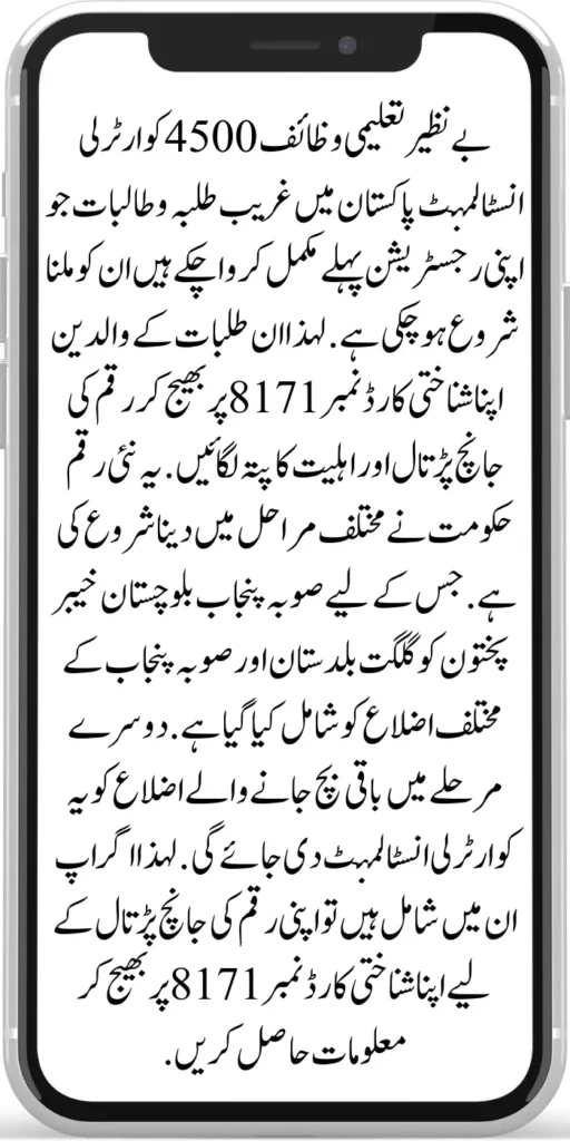Benazir Taleemi Wazaif 4500 quarterly installment have started to be given to the poor students in Pakistan who have completed their registration earlier. So the parents of these students can check the amount and check the eligibility by sending their ID card number to 8171.