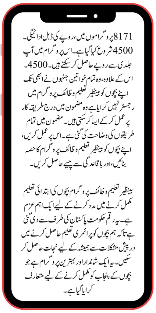 In 8171 programs, a double payment of 4500 has been started. In this program, you can quickly get Rs. 4500. Also, all the women who have not yet registered their children in the Benazir Taleemi Wazaif Program can do so by following the procedure in the article. All the methods are explained in the article. Make your children part of the Benazir Taleemi Wazaif Program, and get money regularly.