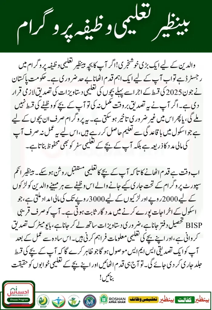 Government of Pakistan has officially resumed the document verification process for the Benazir Taleemi Wazifa June 2025 installment. If your child is already registered under the Benazir Education Stipend program, it is now mandatory to visit your nearest BISP Tehsil Office and complete the verification process to receive the upcoming payment.