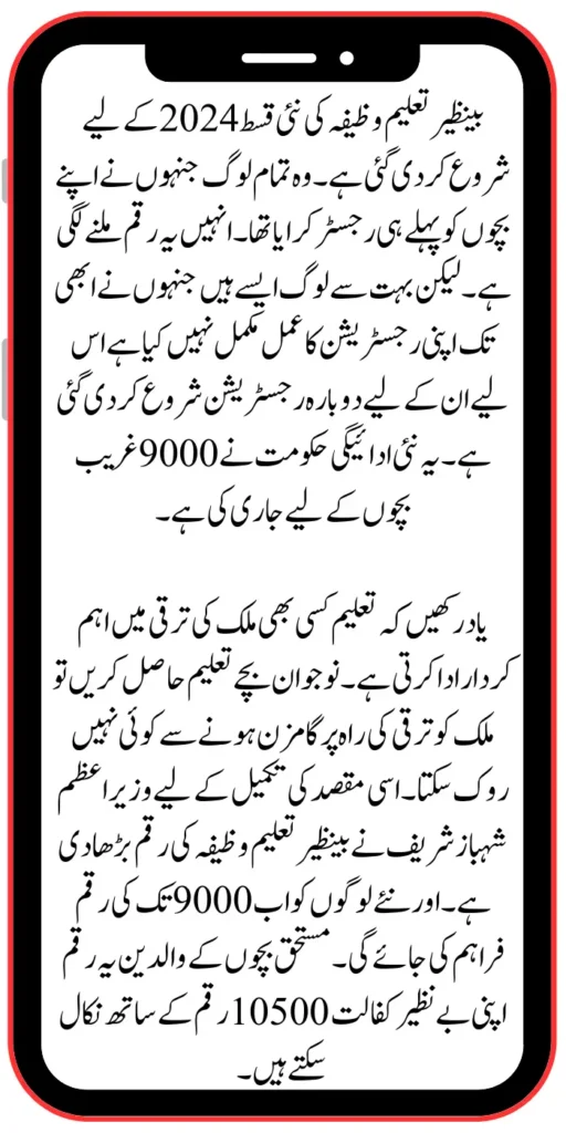 Remember that education plays a role in developing any country. No one can stop the country from progressing on the path of development if the young children get education. To fulfill the same purpose, Prime Minister Shahbaz Sharif has increased the amount of Benazir Taleemi Wazifa. And new people will now be provided with an amount of up to 9000. Parents of deserving children can withdraw this amount with their benazir kafaalat 10500 Amount.
