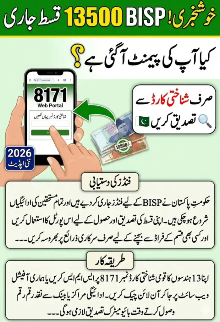 BISP 13500 Payment for 2026 is a vital support for families facing financial challenges across Pakistan. This quarterly financial assistance helps low-income households manage their expenses in times of rising inflation and economic uncertainty. To make the process smoother, beneficiaries can now verify their payment status online using the official 8171 portal by entering their CNIC number. This online system ensures that eligible families receive assistance without unnecessary delays or confusion.