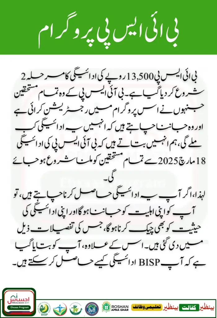 BISP 13500 Rupee Payment Phase 2 has been started. All the beneficiaries of BISP who have registered in this program and want to know when they will get this payment, let us tell them that BISP payment will start to be received by all the beneficiaries from 18 March 2025.