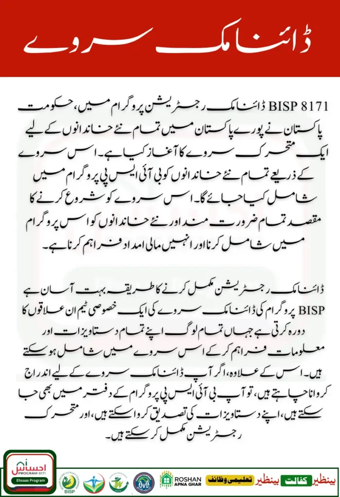 In the BISP 8171 Dynamic Registration Program, the Government of Pakistan has launched a dynamic survey for all new families across Pakistan. Through this survey, all new families will be included in the BISP program. The purpose of launching this survey is to include all the needy and new families in this program and provide them with financial assistance.Β