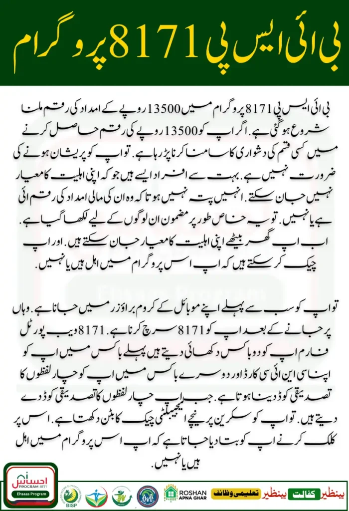 BISP 8171 Program The program has started receiving assistance of Rs. 13500. If you are facing any kind of difficulty in getting the amount of Rs. 13500. Then you do not need to worry. Many people do not know their eligibility criteria. They do not know whether they have received their financial assistance amount or not. So this article is specially written for these people. Now you can know your eligibility criteria while sitting at home.