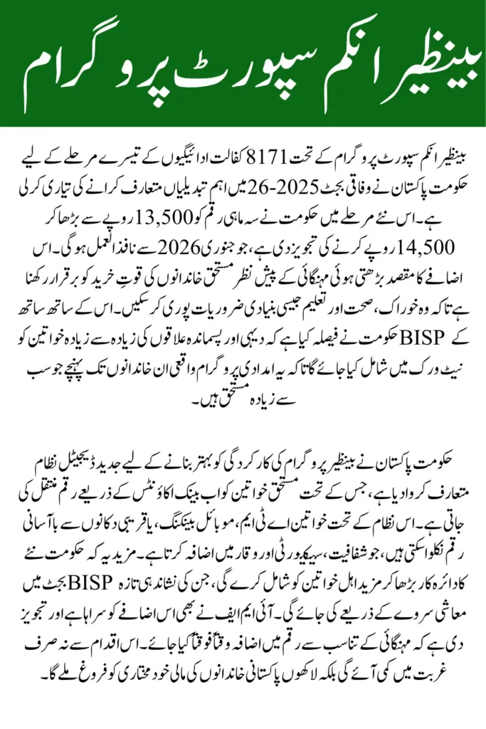 The Government of Pakistan is all set to bring major updates in its flagship social protection scheme, the BISP 8171 June 2025 Update , under the federal budget 2025β26. As part of its commitment to support low-income households, a proposal is currently under consideration to increase the quarterly cash stipend under the BISP Kafalat Program from Rs. 13,500 to Rs. 14,500, starting January 2026. This move comes in response to the ongoing inflation crisis, aiming to ensure that beneficiaries maintain their purchasing power for essential needs like food, healthcare, and education.
