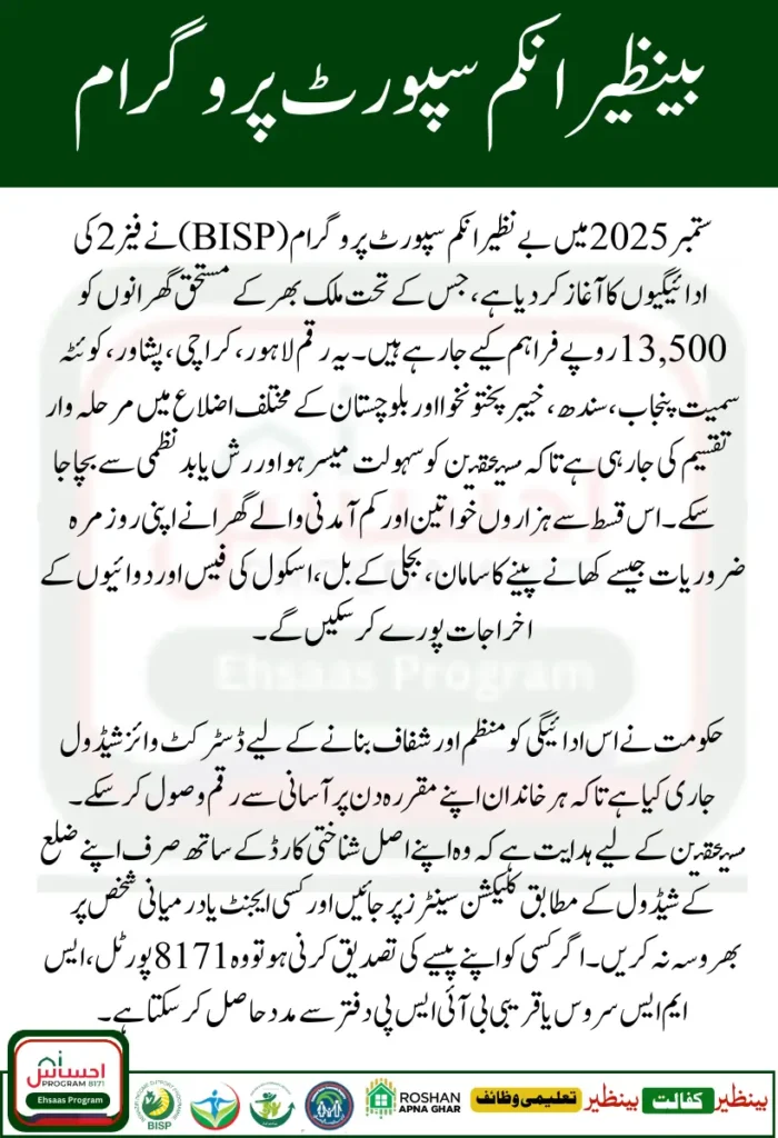 The BISP 8171 Phase 2 September 2025 installment once again highlights the government’s commitment to supporting the most vulnerable households in Pakistan. By following the district-wise schedule, updating CNIC records, and using official verification channels, families can receive their Rs. 13,500 smoothly and securely.