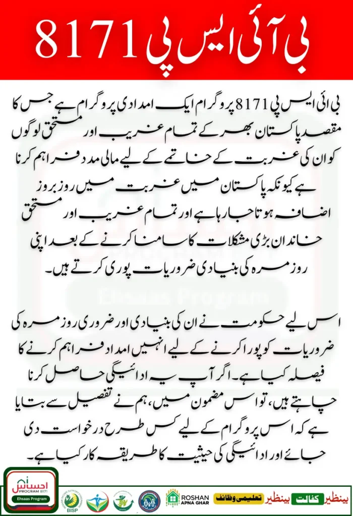 BISP 8171 program is an aid program that aims to provide financial assistance to all the poor and deserving people across Pakistan to eliminate their poverty because poverty is increasing day by day in Pakistan and all the poor and deserving families fulfil their basic daily needs after facing great difficulties.