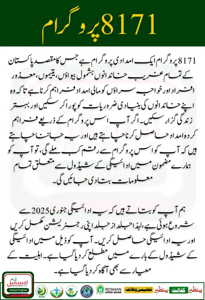 The 8171 program is an aid program that aims to provide financial assistance to all poor families in Pakistan, including widows, orphans, disabled people, and transgenders so that they can meet the basic needs of their families and live a better life. If you want to get the assistance provided by this program and want to know when you will get the money from this program, then you will be told all the information regarding the payment schedule in our article.