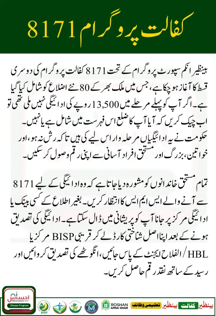 The BISP 8171 Second Phase is now helping thousands of families from 80 new districts. If your district is listed above, follow the process correctly and only visit a payment center once you get the official SMS from 8171.