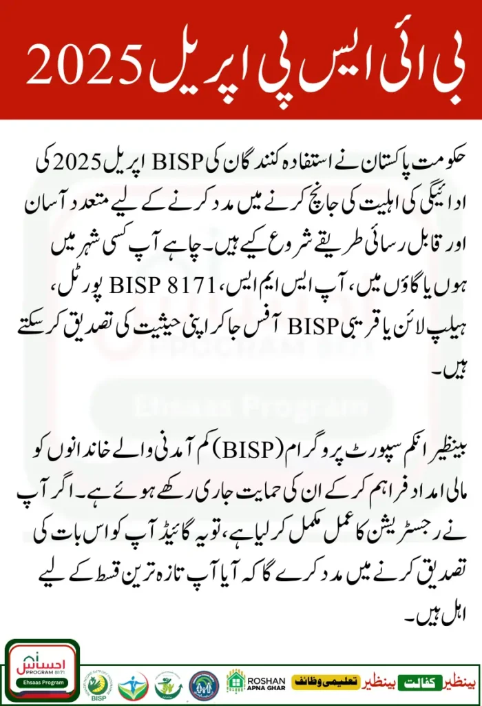The Government of Pakistan has launched multiple simple and accessible ways to help beneficiaries check their BISP April 2025 Payment Eligibility. Whether you’re in a city or a village, you can verify your status through SMS, the BISP 8171 portal, the helpline, or by visiting the nearest BISP office.