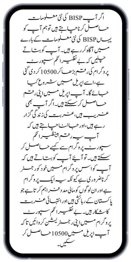 If you want to get new information of the BISP Program, we are informing you here about the new information of BISP. Let us tell you that the amount of the Benazir Income Support Program has been increased to 10500, It will be launched in April. You can get your money in April. If you are also poor, living a life of poverty, and want to know how you can get this money from the Benazir Income Support Program.