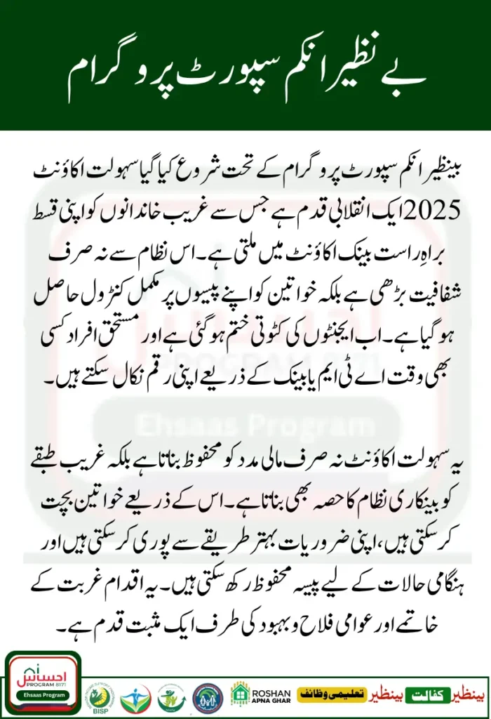 The Government of Pakistan has introduced the BISP Sahulat Account 2025 to make the process of receiving Benazir Income Support Program payments more simple, safe, and transparent. In the past, many beneficiaries had to wait in long queues at campsites or depend on agents who sometimes deducted money. With this new system, every eligible family can directly receive their installment into their own bank account. This gives people control over their money, reduces fraud, and builds trust between the government and the people.