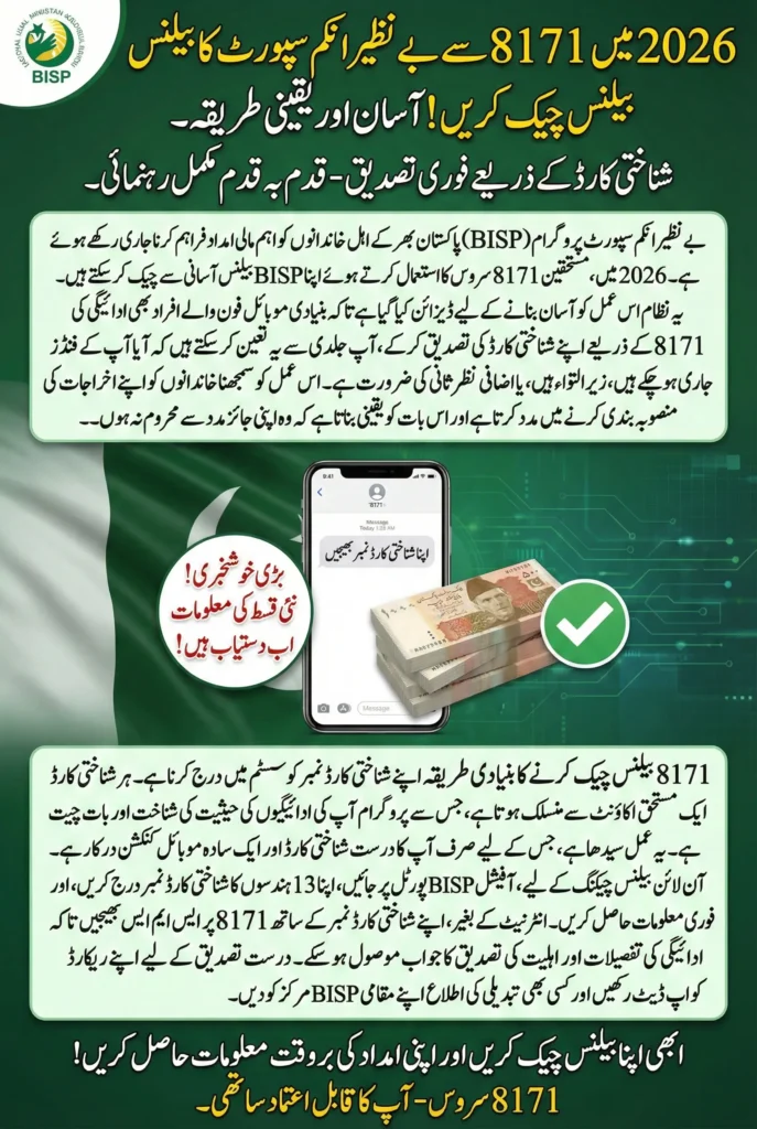 BISP Balance continues to provide vital financial assistance to eligible families across Pakistan. In 2026, beneficiaries can easily check their BISP balance using the 8171 service. This system is designed to simplify the process so that even individuals with basic mobile phones can confirm payment status.