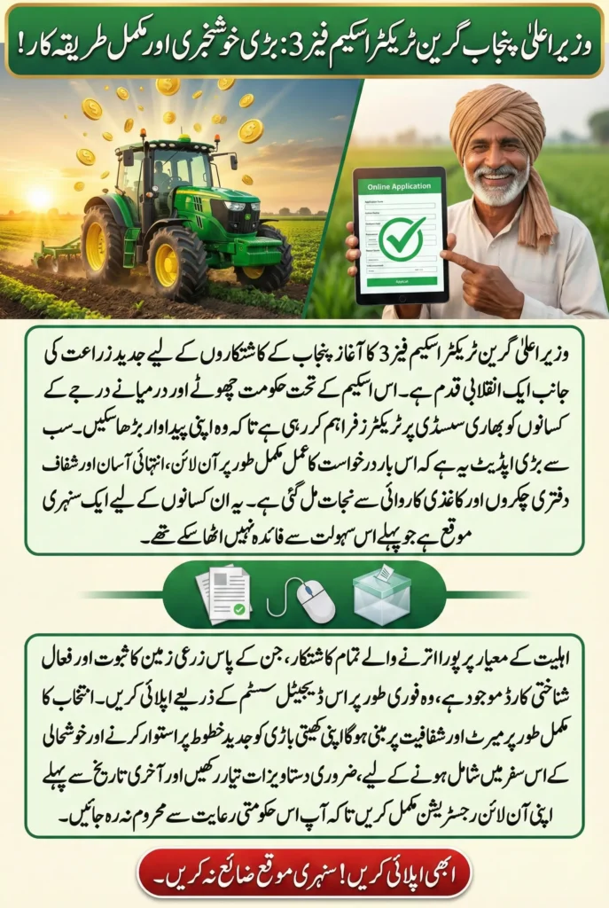 The CM Green Tractor Scheme Phase 3 stands as a practical and forward-looking initiative aimed at strengthening Punjab’s agricultural sector. By simplifying the application process, ensuring transparency, and focusing on genuine farmers, the scheme addresses real challenges faced in rural areas.